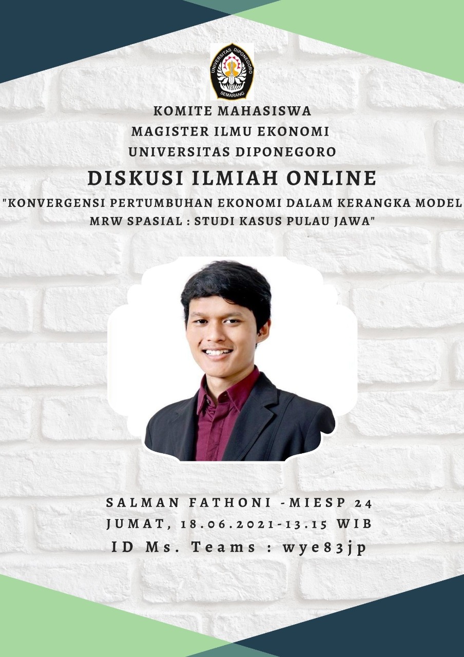 Magister Ilmu Ekonomi Universitas Diponegoro mengadakan Diskusi Ilmiah pada hari Jum’at 18 Juni 2021. Diskusi Ilmiah disampaikan oleh Salman Fathoni selaku mahasiswa Magister Ilmu Ekonomi angkatan 24 dengan tema “Konvergensi Pertumbuhan Ekonomi dalam Kerangka Spatial Mankiw-Romer-Weil Model : Studi Kasus Pulau Jawa”.