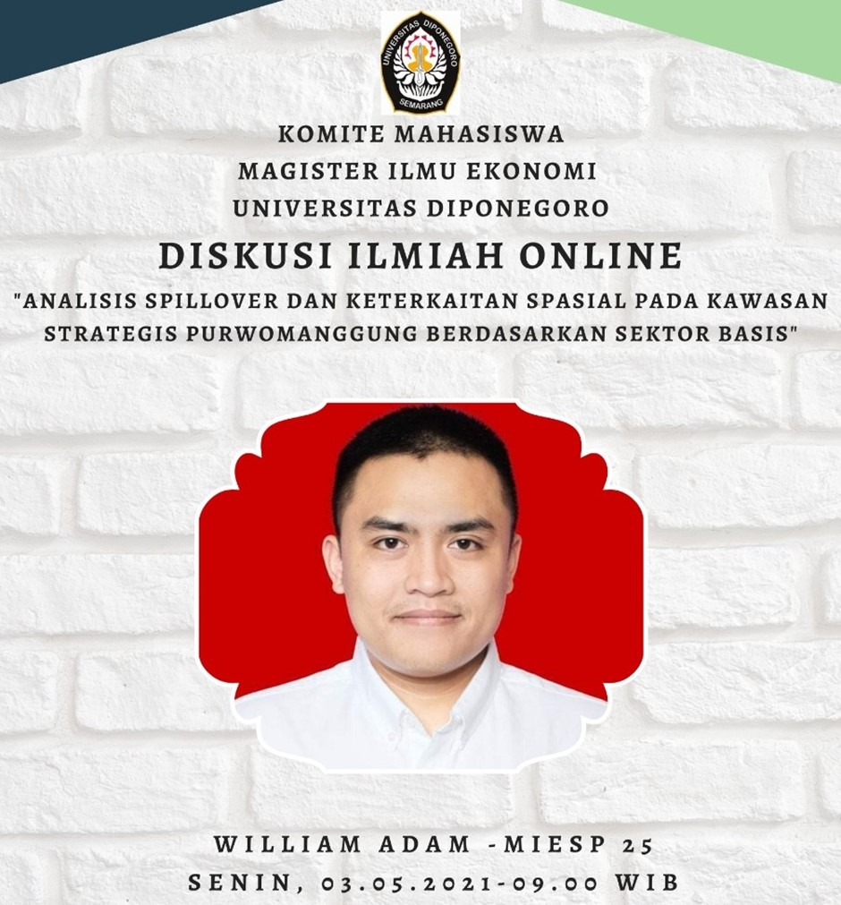 The Diponegoro University Masters Committee in Economics (MIE) held a Scientific Discussion on May 3, 2021 which was filled by William Adam (MIE 25 Student) with the theme Spillover Analysis and Spatial Linkages in the Purwomanggung Strategic Area Based on Base Sector