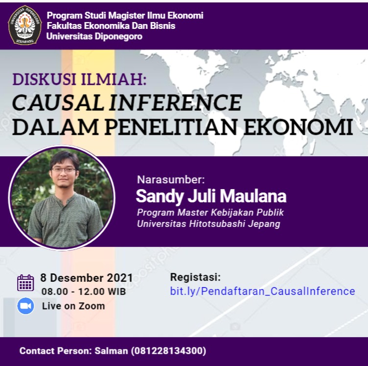 Realizing that this is a fundamental issue in Economics, as well as responding to the latest developments, Master of Economics Study Program, Diponegoro University held a series of Scientific Discussions entitled “Causal Inference in Economic Research”. This series program is expected to be able to facilitate students in expanding their mastery of economic research methodologies, especially in responding to the latest scientific developments. This Scientific Discussion will be held on Wednesday, Desember 8, 2021, online from 08.00 – 12.00 WIB.