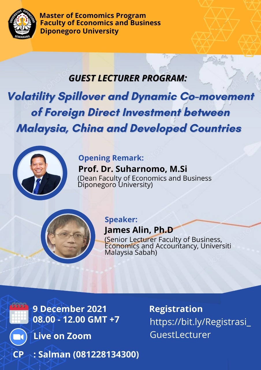 Based on this background, Master of Economics Study Program, Diponegoro University will hold Guest Lecturer Program with the theme: “Volatility Spillover and Dynamic Co-movement of Foreign Direct Investment between Malaysia, China and Developed Countries”. This forum is expected to be able to provide knowledge enrichment for the entire academic community at the Faculty of Economics and Business Undip, especially related to spillover and FDI issues and improve an increasingly competitive academic climate. This event will be held on Thursday, December 9, 2021, online from 08.00 – 12.00 WIB.