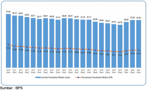 BPS has released Indonesia’s poverty rate for the March 2021 period. The percentage of poor people in March 2021 was 10.14%, decreased 0.05% compared to